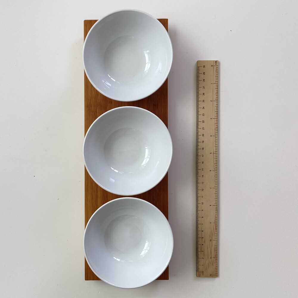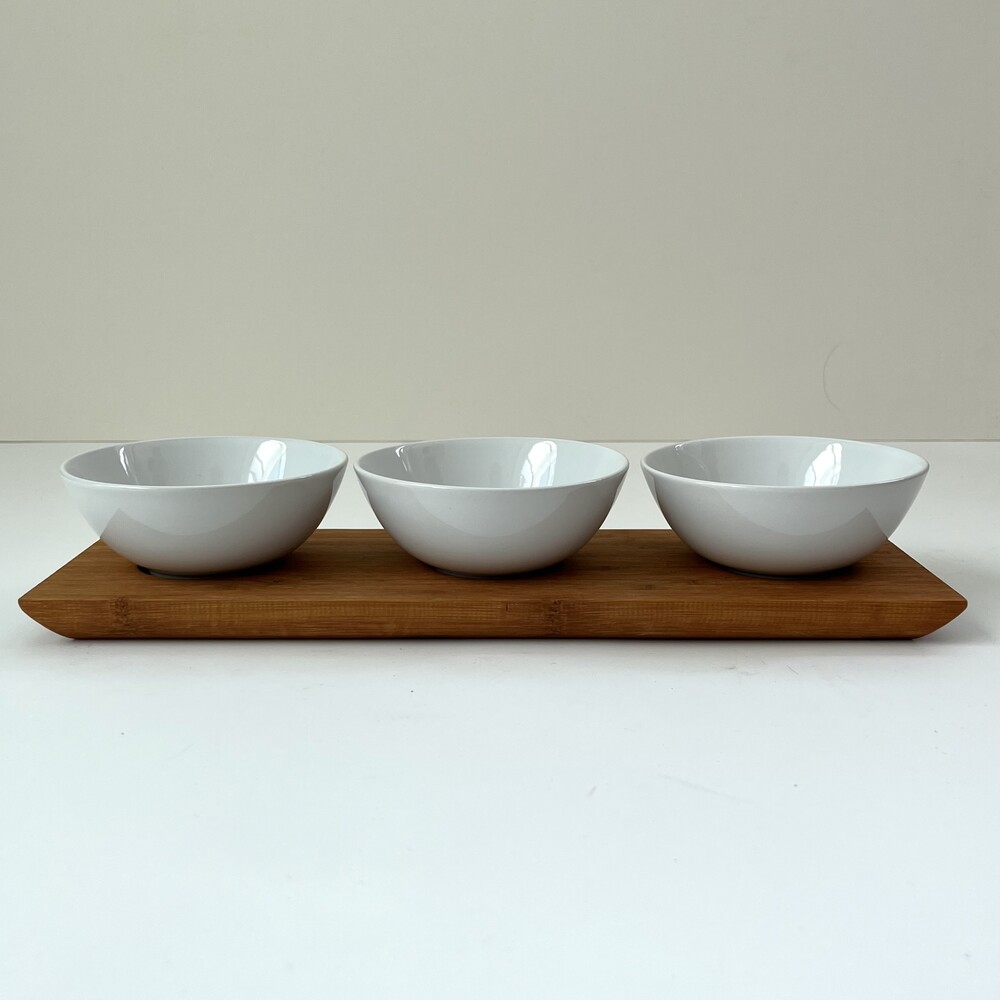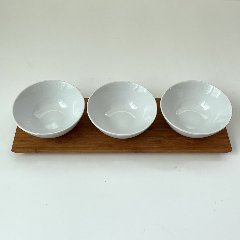 3구 우드 트레이 + 화이트 유광 도자기 공기 set